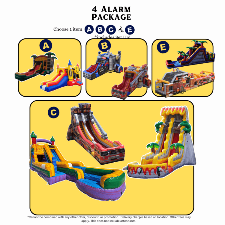- π₯ The 4 Alarm Package is engineered for schools, churches, and community events that need major crowd engagement. With four premium attractions — one from each key category — this setup delivers nonstop activity, smooth flow, and a professional presentation your organization will be proud of.