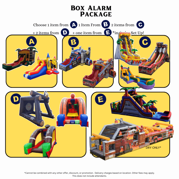 - π₯ The Box Alarm Package delivers a high-volume, high-impact event setup designed for schools, churches, and community organizations that want a strong mix of bouncing, sliding, racing, and interactive play. This package includes one attraction from Category A, one from Category B, one from Category E, and two total selections from Categories C & D.