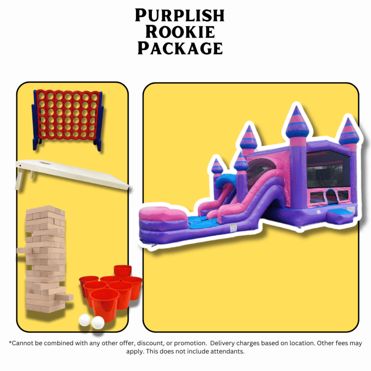 The Rookie Package includes the Purplish Bounce House with Slide (wet or dry) plus your choice of one premium yard game: Yard Pong, Giant Jenga, Giant Connect 4, or Cornhole. Delivery, setup, and takedown are included.